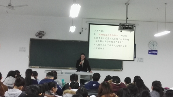 江先文首先根据党章,联系同学们的实际解读了共产党员的八项义务和八项权利,并强调党员权利和义务的关系,以及履行党员义务的重要途径和如何正确行使权利。接着,来自人文信息管理学院、检验医学院的优秀学生党员结合自身感受和学习工作交流了如何“以实际行动争做一名合格的共产党员”。来自365bet体育注册、心理学系入党积极分子代表交流了通过学习培训获得的自我提升和如何在以后的学习生活中发挥骨干的模范带头作用。