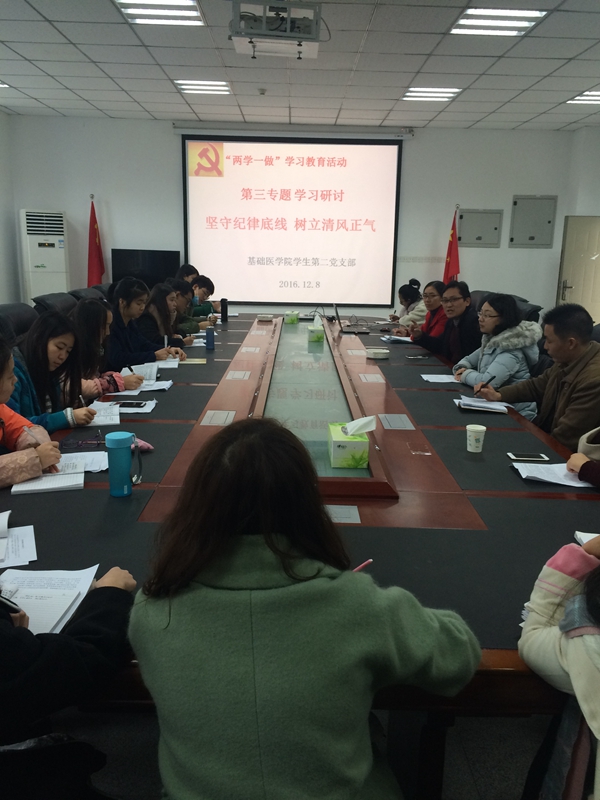 12月8日,365bet体育注册学生第二党支部组织全体师生党员在院会议室召开“两学一做”第三专题“坚守纪律底线,树立清风正气”学习讨论。支部书记郑蕖主持会议,学校养老与老年健康协同创新中心副主任李茂全和365bet体育注册党委书记江先文参加学习讨论并作指导。